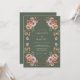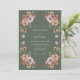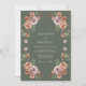 Denna design har en djup mossgrön bakgrund dekorerad med dystra akvarellblommor. Arrangemanget inkluderar dämpade mauve rosor, terrakotta-blommor och mjuka persikofärgade peonior omgivna av delikat lövverk. Den jordnära färgpaletten och organiska estetiken skapar en romantisk känsla för höstliga eller vinterbröllop.