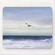 En mås svävar över skummande vågor på en strand vid Outer Banks.