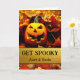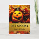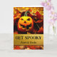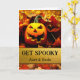 Hämta Spooky! En Jack av'Lantern med en läskig toothy flin och omgiven av höst löv dekorerar omslaget på Halloween-hälsningskortet för en moster och morbror. Anpassa texten på omslaget och inuti som du vill. Art, bild och versell copyright © Shoaff Ballanger Studios, 2023.