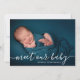 Presentera din lilla en på det sötaste sättet med det här eleganta födelsekortet ”Meet Our Baby”. Designen har en layout med ett stort foto som framhäver ditt nyfödda barns första porträtt med modern handskriven typsnittsstil och en ren minimalistisk stil.