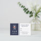 Ett besökskort för en hårstylist i marint blått och vitt med ett par vita saxar som dekoreras med handdragna blommor i orange, rosa och rött.