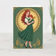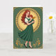 This design shows a woman with cascading auburn hair holding a small, winged child close against her chest, their faces turned toward each other with a tender, trusting look. She wears a deep emerald dress over a white blouse, and her blue eyes and slight smile give the scene a gentle, affectionate tone 💚. The child echoes her fiery curls and nestles in her arms as if settling into a safe embrace, with soft golden wings catching the light. Behind them, a dark green field sets a calm stage, while a glowing gold circle surrounds the pair like a halo, warming their skin tones and hair. In the lower corners, delicate gold floral motifs curl upward, adding ornate detail that frames the figures without crowding them ☘️. Any text would sit best near the top in small gold lettering, with a second line near the bottom in matching gold to balance the composition. The gold circle remains centered behind their heads, and the corner florals stay anchored low left and low right, like gilded vines against the green backdrop.