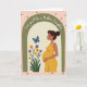 Designed with a gentle illustration of a pregnant woman centered in profile, one hand resting on her belly as her closed eyes and small smile suggest a tender, affectionate daydream ❤️. She wears a sunny yellow dress, and her dark hair is swept back neatly to keep the focus on her calm expression. A soft olive-green arch frames her like a welcoming doorway, adding a cozy, sheltered feeling to the scene. On the left side, clusters of yellow and purple wildflowers lean upward as if reaching toward her, bringing a quiet sense of companionship and care 🌼. Above the flowers, a bright blue butterfly hovers mid-flight, adding a light, romantic touch through its delicate motion. The background is a warm cream tone, surrounded by a pale pink border dotted with deeper pink circles. Curved text sits overhead in a dark tone, reading “Soon you’ll be a Mother-Daughter,” following the arc above her head. The pink frame with darker polka dots wraps around the creamy center like a soft picture window.