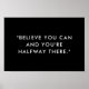 Motiveringellt citat poster med "tro att du kan och du är halvvägs" i modern minimalistisk svartvit skrivmaskin.
