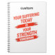 This bold minimalist design features striking red typography on a black background with the powerful message “Your Suffering, Your Strength.”