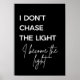 Clean, bold, and quietly powerful. This minimalist typography design features the quote “I Don’t Chase the Light, I Become the Light,” blending strong modern lettering with an elegant script accent. It’s made for anyone focused on growth, confidence, and self-leadership rather than chasing validation.
