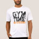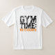 En t-shirt med den motiverade sloganen "Gym Time No Excuses" i svart och orange fet grunge text typografi.