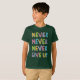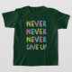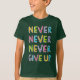Anpassadet skjortor med motiverande slagord för beslutsamhet och självförtroende - aldrig Ge up - i färgstark typografi, tecknad stil. Välj skjortan stil och färg bland de modeller som finns tillgängliga för kvinnor, manar eller barn.