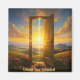 Ett strålande nyckel som glöder i vibranta gyllene nyanser och låser upp en dörr till en solljus med lush grönt fält och ett tydligt himmel.