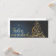 La tarjeta navideña presenta un elegante árbol de Navidad dorado formado por estrellas centelleantes sobre un fondo azul oscuro. La inscripción ’Feliz Navidad’ en letras curvas doradas redondea con estilo el sjuk ño festivo. 🎄 ✨