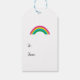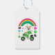 En söt hund på en motorcykel omgiven av en färgstark regnbåge och stjärnor med skräddarsydd/personlig text på baksidan. Design för barn.
