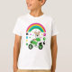 En söt hund på en motorcykel omgiven av en färgstark regnbåge och stjärnor, design för barn