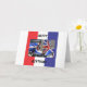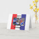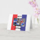 Ett rött, vitt och blått kort med en designad skopa på framsidan