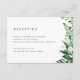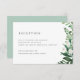 bröllopsmottagningsdetaljer med dina gäster med elegantens botaniska inhägnadskort, designade att samordna med vår svit från Greenhouse bröllop. Utformningen innehåller dina mottagningsdetaljer, inklusive tidpunkt, plats och adress, i mjuka, svarta bokstäver på en skarp vit bakgrund som är försedd med små vita blommor och gröntens blad.