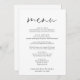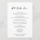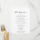 Chicens bröllopsmiddagsmeny med "meny" i ett modernt skript, din anpassade meny i enkel modern typografi och ditt första namn- och mottagningsdatum i elegant serif-typografi.