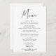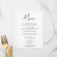 Chicens bröllopsmiddagsmeny med "Menu" i ett modernt skript i snyggten, din meny i enkel typografi, ditt namn gått med av ett hjärta och ditt mottagningsdatum.