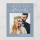 Modern dammiga blått budgetvänligt brev/privat meddelande och mottagning från bröllop sparar det datum som innehåller ditt foto och "Spara datumet för vårt lyckligtvis allt efter Party" i modern vit typografi och ett vitt skript i chic med dekorationer. Lägg till ditt första namn, mottagningsdatum och plats. På baksidan anpassar du ditt meddelande och din mottagning från bröllop och sparar datuminformationen.