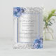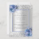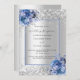 Faux silver tittar bakgrund som dekorerats med blå ro, blommor och konetti. Anpassa och lägg till information om namn och bröllop. Black brev.
