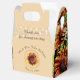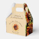 Den här förmånslådan är en del av min solrosolja Bröllop. Med ett textbyte skulle det också vara lämpligt för alla sommar- eller höstteman i party. På vardera änden visas ett foto av ett kluster av söt ombre tittar solblommor som går från gyllene gulter på de spetsar som lutar mot rostig orange i mitten. Den övre lutningen dekoreras med strängar av fairy ljus. På framsidan finns en enda solrosa i en smal ljusbrun ram med parets namn och datum för tillfälle. På baksidan är samma ram med ett inledande monogram och mer text. All text kan ändras till vad du vill.