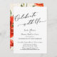 I denna eleganta design har jag använt ett vackert, virvlande kalligrafiskt teckensnitt för att skapa en grafisk typografi-överlägg som läser "Fira med oss". Fyll i mallens tomma fält med dina evenemangsuppgifter för att anpassa designen. Alla lager lades till separat och lämnades olåsta så att du också kan klicka för att ytterligare anpassa och flytta text eller till och med ändra storlek eller teckensnitt. Baksidan av kortet var täckt med en djärv design med röda akvarellvallmor. Bakom det finns en bild som visar guldconfetti. Så festligt! dessa kan ersättas med en annan bild eller bilder om du föredrar en annan look som en följeslagare till denna eleganta, enkla framsida.