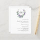 En vit bakgrund som dekorerats med en lavender-blomma och eucalyptus-greenery-andedräkt, vapensköld. Anpassa och ditt monogram, namn och detaljer. 1 lakan = 1 inbjudan tryckt kant till kant.