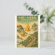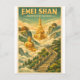 Travel poster featuring Mount Emei (Emei Shan), China, in a classic retro travel-poster style. Central focus on mist-covered sacred peaks with ancient temples perched on cliffs, golden Buddha statues emerging from clouds, and winding stone stairways through lush forest. Soft sunrise light and drifting fog create a spiritual, majestic atmosphere. Harmonious color palette of jade green, cloud white, stone gray, and warm gold. Clean graphic illustration with subtle vintage grain texture. Bold vintage typography headline: “EMEI SHAN – MOUNTAIN OF BUDDHA”. Vertical 2:3 layout, high-resolution, print-ready.