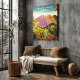 Mount Teide rises over Tenerife in a bold, sunlit travel poster style. The volcano peak, warm slopes, tropical foliage create a dramatic focal point for a living room, bedroom, office, or vacation rental. Ideal for Canary Islands lovers, Spain travel fans, hikers, plus anyone building a curated gallery wall of world landmark canvas prints.