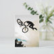 En freestyle-cykelförare är mitt i luft som en silhuett som gör en kroppsvarial.