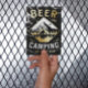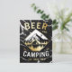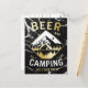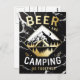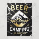 En grafisk illustration på en svart marmorbakgrund med ett bergslandskap, tält, måne, och stjärnor i guld diamant ram som läser Beer och Camping Go Together.