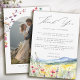 This wedding thank you card features a watercolor mountain landscape and a blooming wildflower meadow. Designed for mountain destination weddings, national park ceremonies, and rustic outdoor celebrations, the aesthetic focuses on a scenic and organic nature theme.