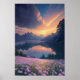 Från backe vid solnedgången fångas en andningssyn på ett serenberget sjö under solnedgången. Himlar är målat med varma orange-, rosa- och gulter som reflekterar lugnen vatten nedanför. I förgrunden ses en fält av vackra vilda blommor från rosa, som svävar försiktigt i coolans kvällspressning. Det omgivande landskapet är utgjort av hög grönt träd, vilket ökar lugnet på scenen.