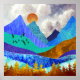 Den här fantastiska konstruktionen skildrar ett färgstarkt bergslandskap med puffig grumlig himmel och rullande backe i fetstilt struktur och färg som blått, teal, cyan, guld och orange.