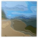 En ljus, färgstark abstrakt utformning av ett bergsperspektiv, med blå himmel, sten och träd.