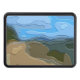 En ljus, färgstark abstrakt utformning av ett bergsperspektiv, med blå himmel, sten och träd.