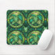 "Mouse pad with a tropical leaf motif, featuring vibrant green leaves in a circular, stained-glass style pattern. A white mouse is shown on the pad."
