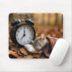 A small mouse peacefully naps on a patch of dry leaves, snuggled under a plaid blanket, while a classic alarm clock stands beside it, contrasting with nature's tranquility and the passage of time