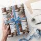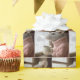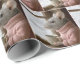A gray mouse in a pink turtleneck holds a warm cup of coffee and gazes out the snowy farmhouse window, soaking in the serene winter landscape