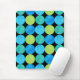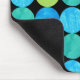 En sjudande färgad Mousepad med "Blue Måne abstrakt mönster i ljusblues och neon grönt på svart bakgrund, från en handmålad papper kollagedesign av Judy Adamson.