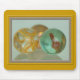 Tre glaspärlor är inramade i guld, med grått "mat". Sömmarna är klara med orangens vridning, fast "koppar"-färgad och blåfärgat glas med orange globule i mitten.