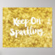 "Behålla On Sparkling" citat på en mousserande guld-bäckenbakgrund med suddig bakgrund.