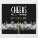 Skål för 21 år och Grattis på födelsedagen på en svart bakgrund. De här mousserande etiketterna vin flaska som är högst upp på ett mousserande vin flaska, ett gnistbildande och suddigt vitt ljus. MATCHING-objekt i vår butik.