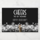 Skål för 21 år och Grattis på födelsedagen accentuerar de små mousserande vin flaska-etiketterna som är högst upp på ett mousserande vin flaska och suddigt vitt ljus mot svart bakgrund. MATCHING-objekt i vår butik.
