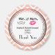 En tack-magnet med en modern bröllopsdesign - glamorösa rosa kyssiga läppar och en manlig retro-utseende mustasch illustration. Placerad på en persikofärgad chevron-bakgrund med en cirkel överst. Cirkeln har en roséguld gradientkant. Texten inuti säger Mr. och Mrs. och du kan anpassa med dina namn och bröllopsdatum.