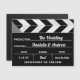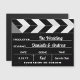En roligt och en unik svart- och vit bröllop spara datum-magnet-design visningar de viktiga detaljerna på en Hollywooddirektörs filmclapper board/svarta board. Anpassa till namn om "stjärnorna" och detaljerna för din stora "premiär" som make och fru.