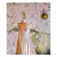 En digitalmålning av en Smew i en rosa blixtklänning med snöre halsband. Det finns en stol med vit klänning och hatt som vilar på den. En antika silhuett porträtt i ett anka-huvud i en mörk brun, rund, bild ram, hänger på väggen. Muren är rosa tapet med tropiska fåglar. Copyright ©2017 Kimberly J Tilley.