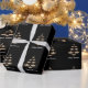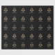 Julomslag papprare med åtta gula, fyrpunktsformade krona i en Julgran utskrift med en liten champagne färgad stjärna. God jul text nedanför krona träd. Guld, Champagne och White på svart bakgrund.
