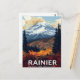 Celebrate the dramatic beauty of the Pacific Northwest with this stunning vintage travel poster postcard for Mount Rainier National Park, Washington. The artwork captures the majestic, snow-capped Mount Rainier towering over a vibrant landscape of autumn foliage, winding roads, and dark pine forests. This design is perfect for nature lovers, hikers, National Park enthusiasts, fans of retro WPA style art, or anyone who loves the fall season. A wonderful souvenir or gift that captures the scale and glory of this iconic volcano.