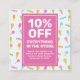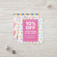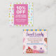 Börjar din godisaffär med sött deljus och redo för försäljning? om ditt godisland med ett rabattkupongkort som kommer att locka kunder till ställe-beställningar i din butik. Vem gör inte kärlek godis, choklad, muffinsar och fam? Den här leksaken väcker glädje med ett godis mönster av popsiklar, glass, lollips och candies i lycklig färg som kommer att få kunderna att ge upp sin söta tand på butiken. Du kan lägga till det här speciella erbjudandekortet i evenemangssäckar och andra sätt att annonsera om din försäljning och få fler kunder till ditt företag för online- eller godis eller chokladvaror. Konstruerade för kandisbutiker och bagerier som säljer bakade varor, muffinsar, kandiser, choklad, glass-butiker och andra godis och dessertföretag. Med kortet kan du ange din procentuella försäljning, dina villkor och villkor och lägga till din affärsinformation.