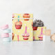 Söt presentfigursättning med färglös cupkaka mönster på ljusa gultens polka-punktbakgrund.
