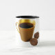 I den här bilden visas ett vitt keramiskt mugg med svart insida och handtag, med en snyggt av ett gyllene kaffe kopp fyllt med mörk brö, tillsammans med två realistiska kaffebönor. Eleganten, den minimalistiska utformningen gör den till en perfekt för kaffe älskare eller som en chic till vilket kök eller kontor som helst - perfekt för att njuta av din favoritbrygga på morgonen i stil.